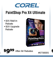 Just ran across this good offer from Fry's on PaintShop Pro X4. After a $35 rebate and a $20 upgrade rebate (from a competing product or earlier version of PSP) it is only $9.99. This is the Ultimate version that includes a full copy of Nik Color Efex 3.0.