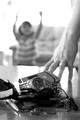 Love the idea, but the glaring bright background took it down for me. Perhaps modifying the shot to include a hint of action/urgency on the father's part as well. Like have the pile of pocket stuff and the watch being tossed onto the pile (or wallet or whatever is less fragile).