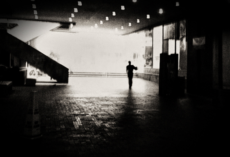 | I like the way the figure is framed in light, the light framed in darkness, and the long shadow of the figure links the two areas. |