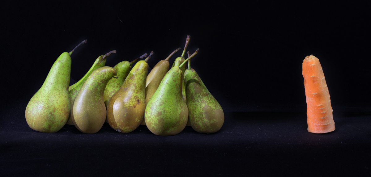 | Those pears exhibit quite a bit of personality. I like the way they lean towards the shrivelled old carrot and the conspiritorial heads-together of two of them. |