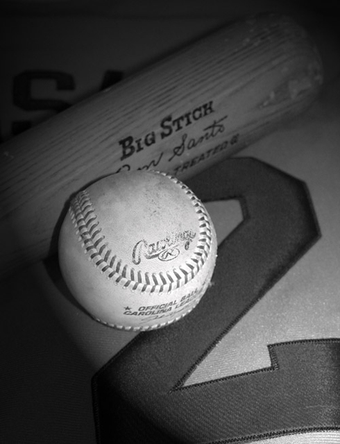 | The light falls strongest on the ball, giving away the photographer's bias in this "best friends" love/hate friendship. The bat is too dull, out of focus or simply not well lit. Nice compositional choices. |