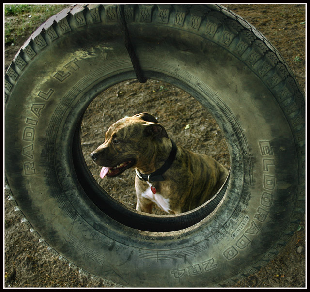I like how his brindle coat kind of mimics the tire after being out in the sun! Great natural frame. He IS cute. Love it.