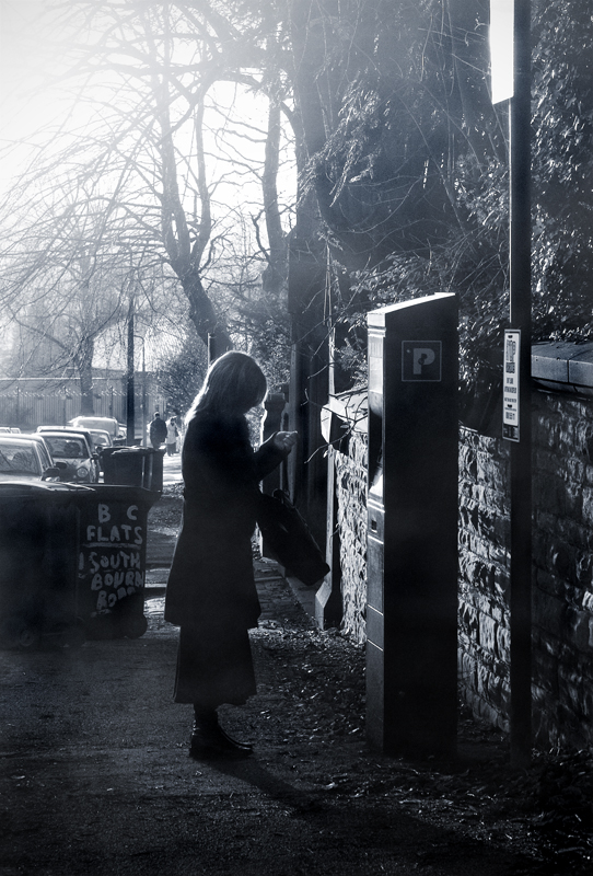 flawed? There is something intruiging about this image I think its the way the machine kind of towers over the lady and the writing on the bin. I also like that you havent blured out the background because the two people on the sidewalk add to the image.