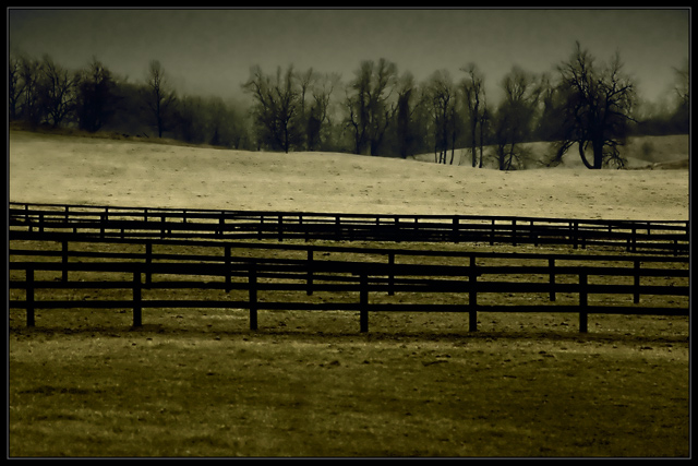 | Very nice shot. The tree line echos the fence lines wonderfully. Such a bleak and dreary feeling you've captured. |