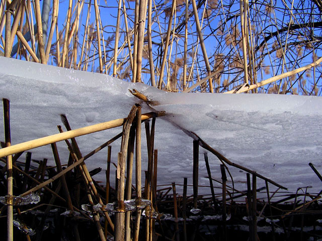 | Very "cool" perspective. I liked almost everything about this shot. Maybe would have gone for slightly more depth of field. With that flat sky, you could have gotten away with a little more detail on the reeds above the ice line, but that is a very minor suggestion. |