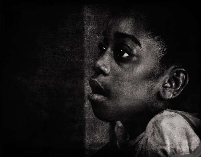 | Look at those ginormous eyes! Wonderful image - love the division down the middle and the look you captured. I'm in favor of the BW in this case. |