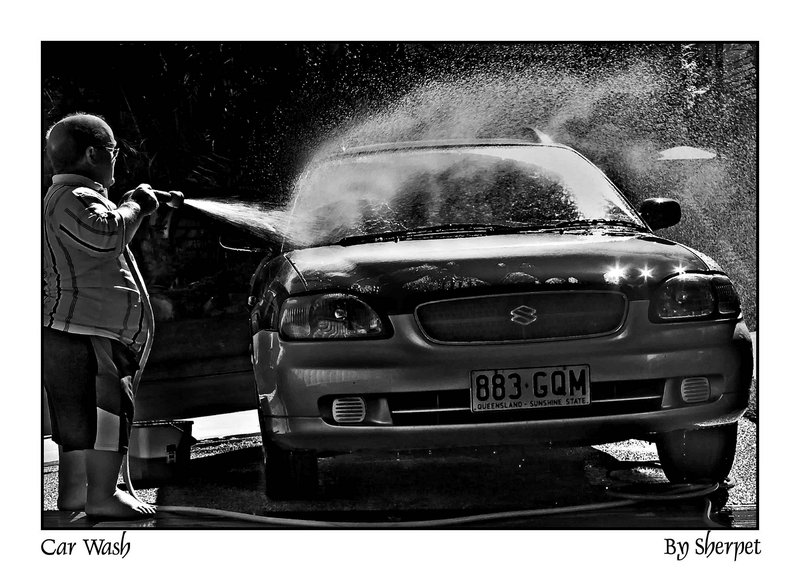 | Great image- I love the sparkles of the water ! peter looks very content washing the car :) |