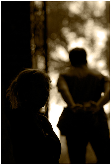 I like this - very nice use of light/dark. I like just that bit of detail on her shirt in the foreground (and the light in her hair) and the very distinct pose of the second figure. Works well.