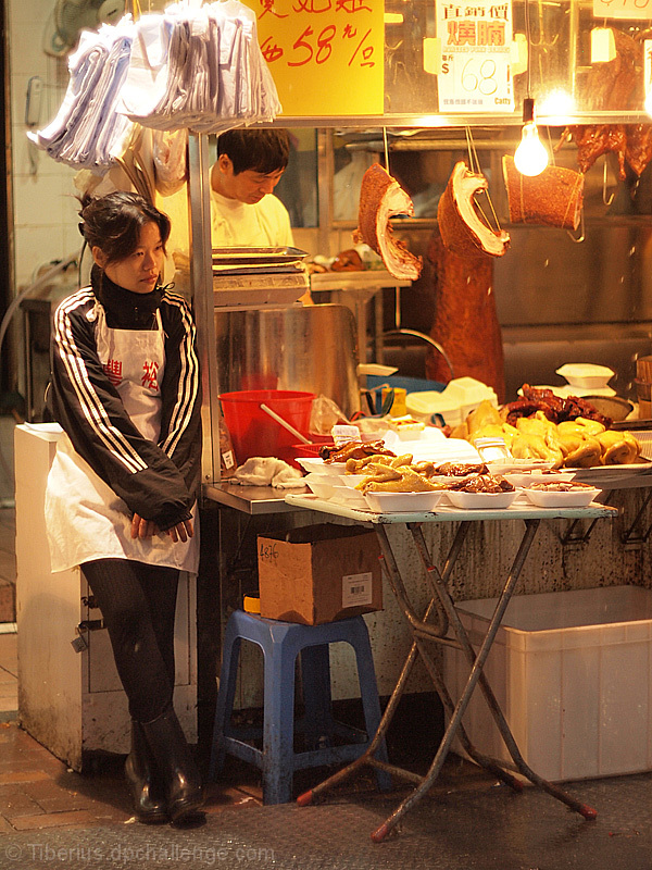 | Don't think she's thinking about chicken... Lovely moment, and that "halo" of bags is gorgeous. I bet this would be even better in b/w |