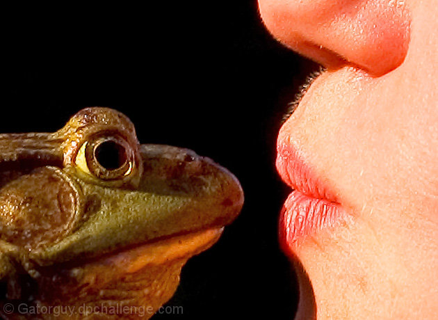 | Good idea and a nice picture. I really like the composition and I think the crop is perfect. The shadow cast by the frog on the person's chin is the only thing that detracts from this shot for me. |