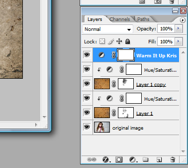 We only want to desaturate the texture layer, not the original image so click ok for now. Hold down the alt key and hover between the hue/saturation layer and the texture layer. An arrow and few circles will come up- then click. Notice a small arrow is now pointing to the layer it will effect. Now you can adjust the hue/saturation layer to your liking. I reduced mine to -85% saturation. You'll probably want to reduce the texture on some areas like peoples faces. To do this click on your texture layer and create a layer mask. You can use the paintbrush tool with black to paint away the texture. If you think you've gone too far and want to bring the texture back, just use white! I like to set my paintbrush between 33% & 50% opacity so I don't go too far. I decided duplicate my texture and layer to add a more grunge feel. Just play around at this point to see what you like :)