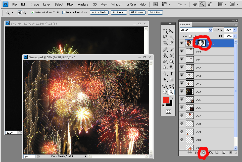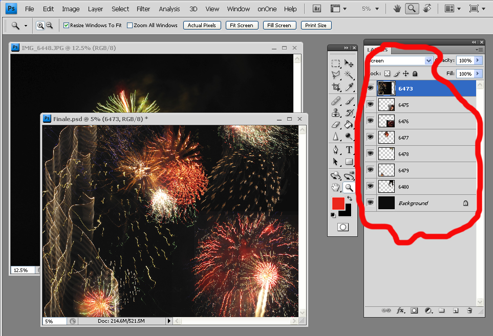 - Keep going, and add as many images as you want. If a firework is too small in the composite, upsize the original before you select, copy and paste so it ends up the size you want in the finale.