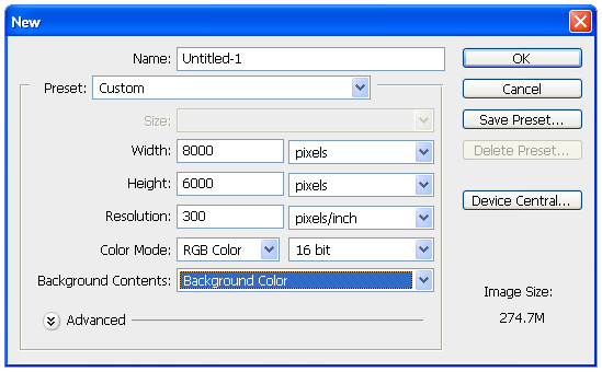 - Next, create a new Photoshop document at your target size and resolution. Since my original photos were taken by a Canon G-10, they were 4416x3312. I chose a new document size of 8000x6000 at 300 dpi. Using the paint bucket tool, fill the photo with a nice sky black, say RGB of 5, 5, 5.
